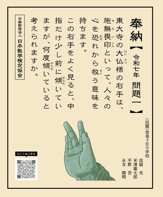 2026年3月に算額を奉納するにあたり、こうした活動を多くの方々により広く、より深く知っていただくため、『「算額1・2・3」コンクール2026 in 奈良』(後援:奈良市教育委員会)を2025年に続き、開催いたします。本コンクールは、市内の小中学校に通学する児童生徒のみなさんに「東大寺」もしくは「奈良市」にまつわるテーマで算数・数学の問題を作っていただき、ユニークな問題を東大寺大仏殿に算額として奉納および表彰するという企画です。児童生徒のみなさんが算数・数学の問題を考えるという取り組みは、探究的な学習の一助につながるものと考えられます。