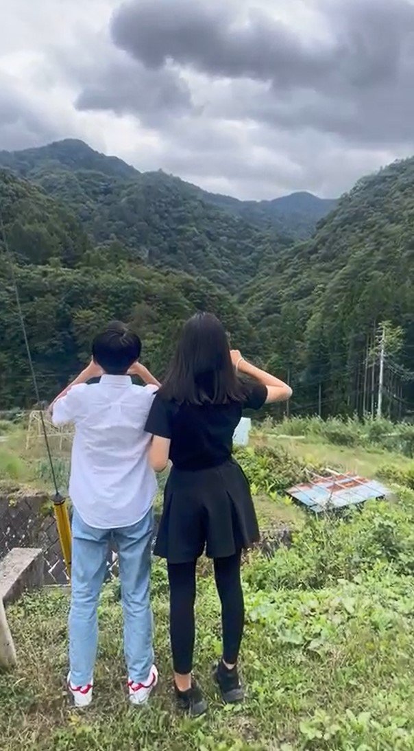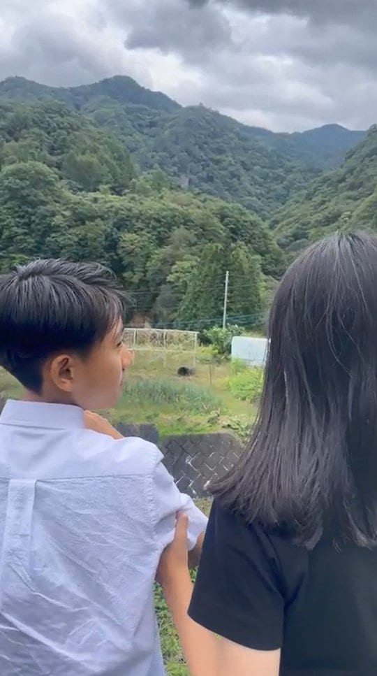 目の前に、緑の山が広がる自然豊かな場所に立っているのは、長女の麗禾さんと長男の新之助さん。