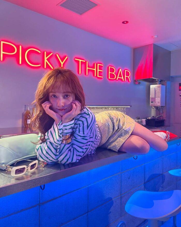 4枚目には雰囲気がガラリと変わり、白と緑のボーダートップスにベージュのミニスカートのコーデでバーカウンターに横たわっているショットも公開。
