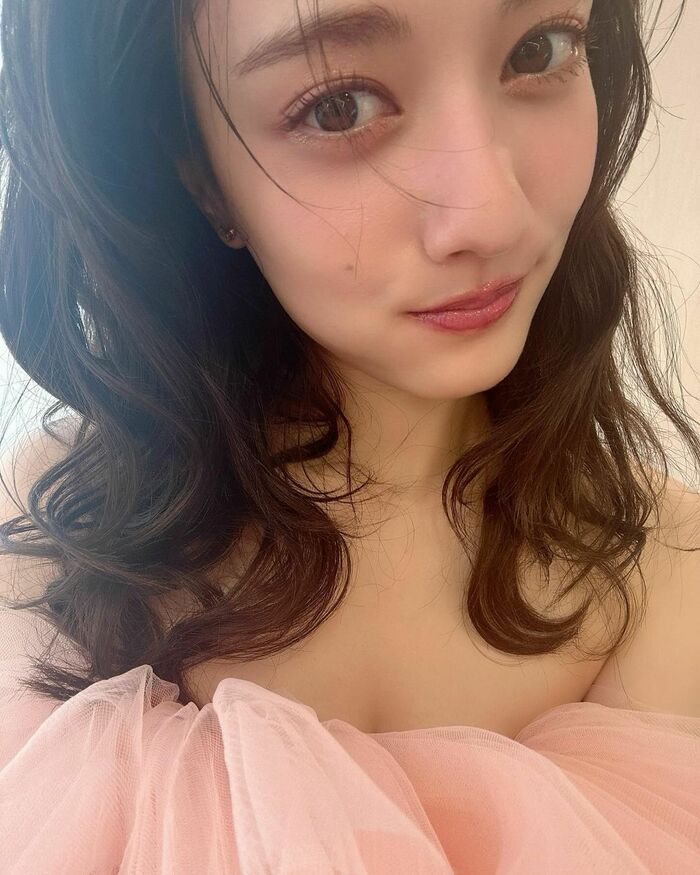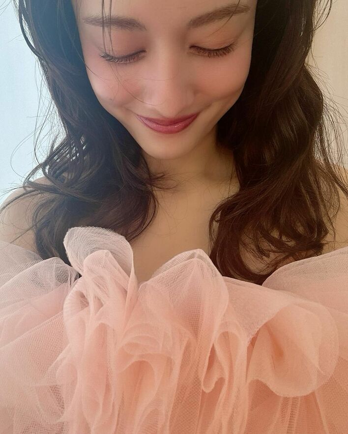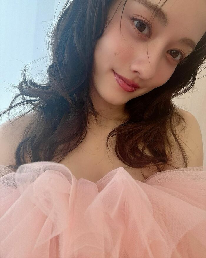 谷さんはチュール素材のピンク色のオフショルトップスを着用したどアップショットを公開。