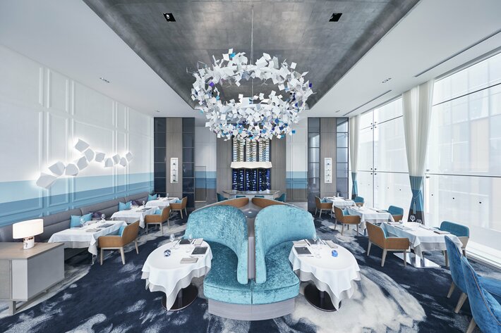 また、FAROでは、日本全国をめぐり生産者とのつながりを深めています。食器やカトラリー、テーブルアクセサリーにいたるまで、日本のすばらしい伝統文化を守りたいという想いから、新潟の組子、多治見や有田の器、今治の織物、江戸切子のグラスなど、“日本の匠の技”にこだわり、とり揃えています。空間は和と洋の融合をイメージしエレガントでスタイリッシュに演出。大地~海~空という自然を感じる色彩のグラデーションを基調とした店内は昼と夜で、それぞれ趣のある表情を醸し出します。驚きと楽しさに満ちたガストロノミーを美しい地中海を想起させるような空間でお楽しみください。