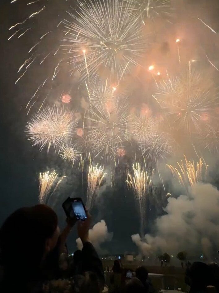 投稿では、夜空を彩るように打ち上げられたたくさんの花火をカメラに収めようと、動画を撮影している大塚さんの後ろ姿が!