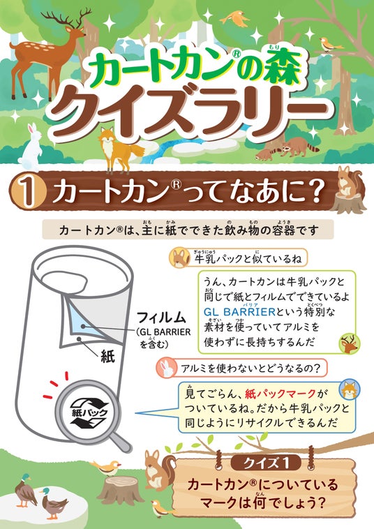 TOPPANが提供する紙製飲料容器「カートカン(R)」に関するクイズラリーを実施します。ブース内に設置された3つのクイズ台で、参加者に正解を選択していただき、木を模した「カートカン(R)」をクイズ台の穴へ投入し、正解の場合は「カートカン(R)」が出てくる仕組みになっています。楽しみながら「カートカン(R)」の特徴や環境への取り組みについて学ぶことができます。さらに、クイズラリーに参加していただいた方に、TOPPANが販売している「カートカン(R)」の天然水をプレゼントします。