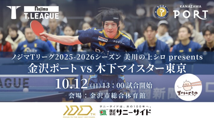 このたび、2025年10月12日(日)に実施をする「ノジマTリーグ2025-2026 金沢ポート vs 木下マイスター東京」の一戦を株式会社サニーサイド(本社:石川県金沢市 / 代表取締役社長 中田 光信)の冠協賛により、「美川の上シロ presentsマッチ」として開催することが決定しましたのでお知らせします。