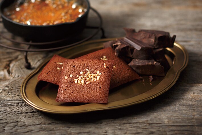 チョコレートと香ばしいカラメルのハーモニーが魅力の一品。2つの味わいが重なった、味わい深いショコラフィナンシェです。トッピングしたアーモンドダイスが、食感と風味をプラスします。シンプルながらも心安らぐおいしさをぜひご堪能ください。