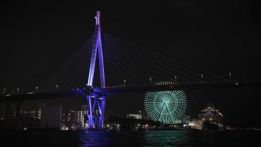 ライトアップされた安治川水門、ユニバーサルシティの夜景、天保山大観覧車の輝き。