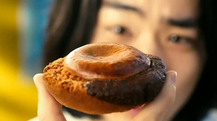 手に取ったドーナツを不思議そうな目で眺めたあと、今まで味わったことのないおいしさに気づき、納得の表情を浮かべるストーリーです。