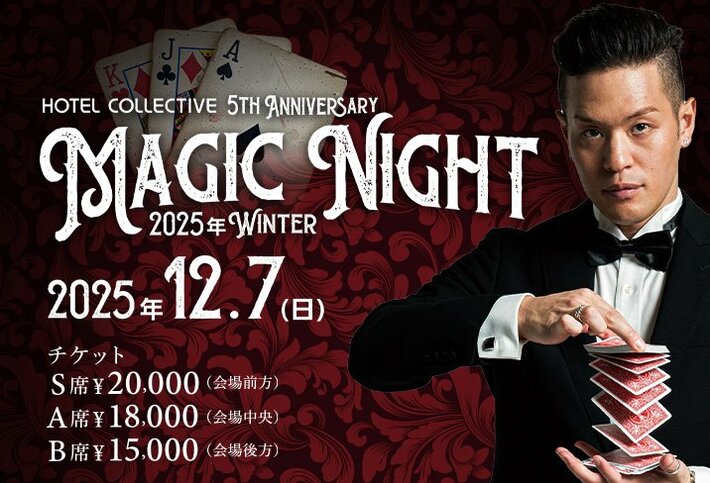 那覇市・国際通りに位置するHOTEL COLLECTIVEは、2025年に開業5周年を迎えました。感謝の気持ちを込めてホテルコレクティブ2階大宴会場にて、好評につき今年で3回目となる世界で活躍するマジシャンMASA MAGICによるマジック&ディナーショー「MAGIC NIGHT 2025 WINTER」を開催いたします。今年はスペシャルゲストとして沖縄出身のアーティストのD-51を迎え、ホテルの料理長が腕によりをかけたスペシャルディナーと圧巻のマジックをお楽しみください。