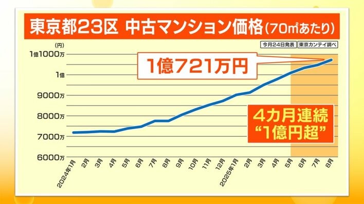 不動産専門のデータ会社「東京カンテイ」が、9月24日に発表した東京23区の中古マンション価格が、1億721万円(※70平方メートル換算)と4カ月連続で1億円を超えました。