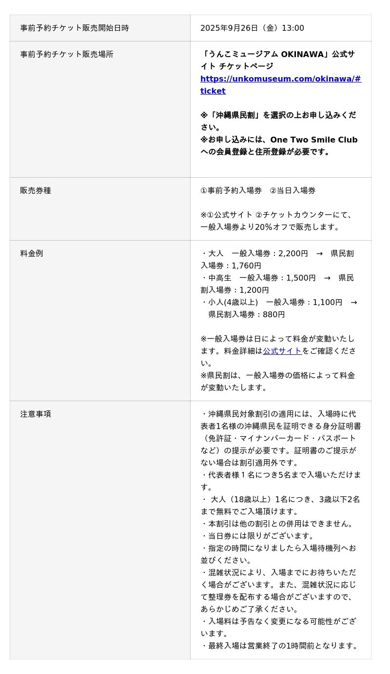 株式会社カヤック(本社:神奈川県鎌倉市、代表取締役CEO:柳澤大輔、東証グロース:3904、以下「面白法人カヤック」)と、体験型エンターテインメント施設「うんこミュージアム」を共同で展開する株式会社たのしいミュージアム(本社:東京都渋谷区、代表取締役:小林将、以下「たのしいミュージアム」)は、2025年9月19日(金)にオープンした「うんこミュージアム OKINAWA」(所在地:沖縄県中頭郡北中城村、イオンモール沖縄ライカム5階)が、オープンからわずか1週間で累計来場者数8,000人を突破し、今週末には1万人に到達する見込みであることを受け、沖縄県民限定で20%割引となる「県民割」チケットの事前予約販売を、当初予定より前倒しして2025年9月26日(金)13:00より開始することをお知らせいたします。