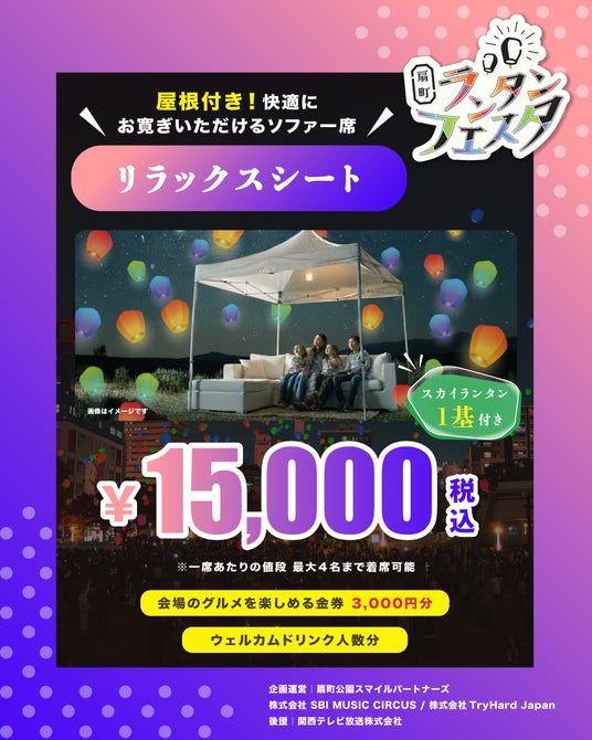 大きなテントの下、4名掛けのソファーでくつろぎながら、夜空を彩るカラフルなランタンを楽しめる特別席。落ち着いた空間で仲間やご家族と一緒に、幻想的な光景を心ゆくまでご堪能いただけます。