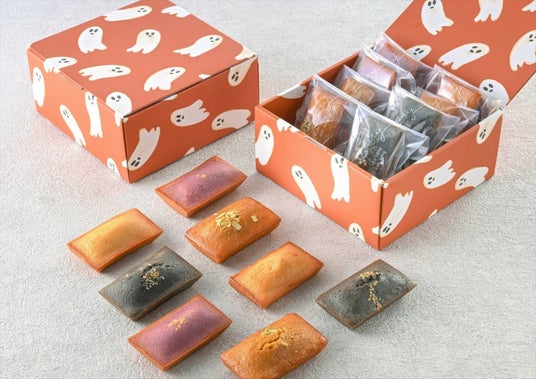 優しい甘さと上品な紫色が魅力の「紫芋フィナンシェ」に、刻んだパンプキンシードの食感が楽しい「かぼちゃフィナンシェ」、黒ゴマの香ばしさと真っ黒な見た目が印象的な「黒ゴマフィナンシェ」。さらに、バターの味わいを存分に楽しめる「北海道バターフィナンシェ」を、おばけが描かれたギフトボックスにアソートしました。ハロウィンパーティや贈り物にもぴったりです。