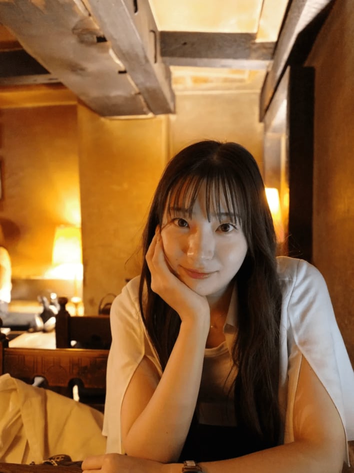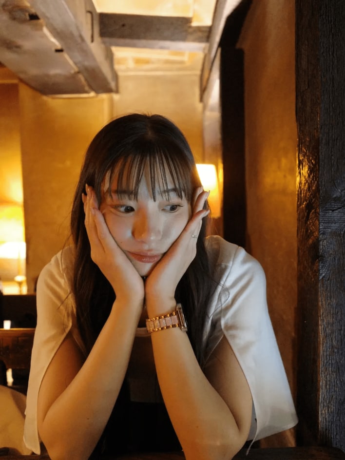 間接照明がついたおしゃれな空間で、ほほ笑みながら片手で頰づえをつく姿がカメラに収められています。袖にスリットが入った上品なシャツを着ていて、大人なデートを一緒に満喫しているかのようです。