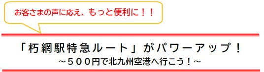 この秋、これまで頂いたお客さまの声にお応えして、「朽網駅特急ルート」の利用がさらに便利になる、JR九州アプリでの「北九州空港特急きっぷ」の発売や、黒崎駅500円定額タクシーの利用を開始します。また、現在実施中のmy routeの割引キャンペーン価格500円の期間を再延長します(9月30日まで⇒12月31日まで)。北九州空港へのアクセスは、早い!安い!便利!な「朽網駅特急ルート」を是非ご利用ください。