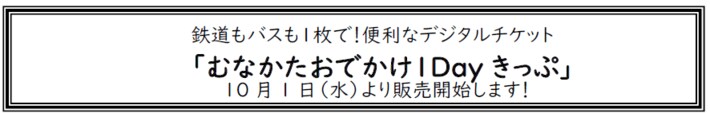 宗像市と九州旅客鉄道株式会社(代表取締役社長執行役員:古宮 洋二)と西鉄バス宗像株式会社(代表取締役社長:川下 英次郎)では、地域公共交通の利用促進と、来街者の移動手段の利便性向上を目的として、デジタルチケット「むなかたおでかけ1Dayきっぷ」を令和7年10月1日(水)より販売開始します。