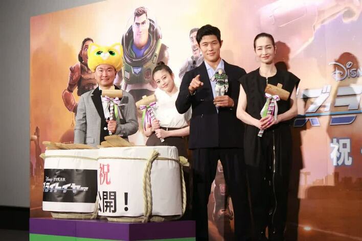 アニメーション映画「バズ・ライトイヤー」の初日舞台挨拶が、7月1日に行われ、日本語吹き替えを担当した、鈴木亮平さん、今田美桜さん、山内健司さん(かまいたち)、りょうさんが登壇しました。