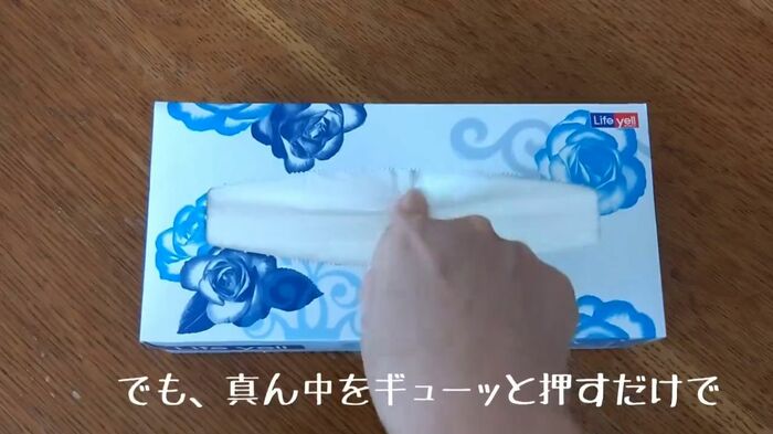 BOXティッシュを開封したら、真ん中を指でギューっと押すだけ。