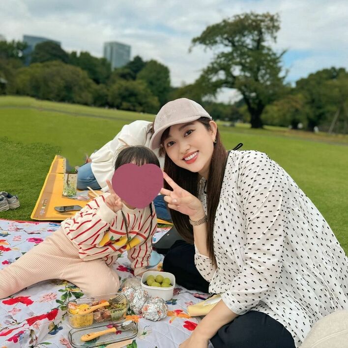 続けて「園も幼稚園ママも皆楽しくて良い人ばかりで大好きなので、私ももちろんしっかり楽しんだよ笑」とつづり、娘とお弁当を囲み、仲睦まじく身を寄せ合いにっこりピースサインする姿を公開しました。