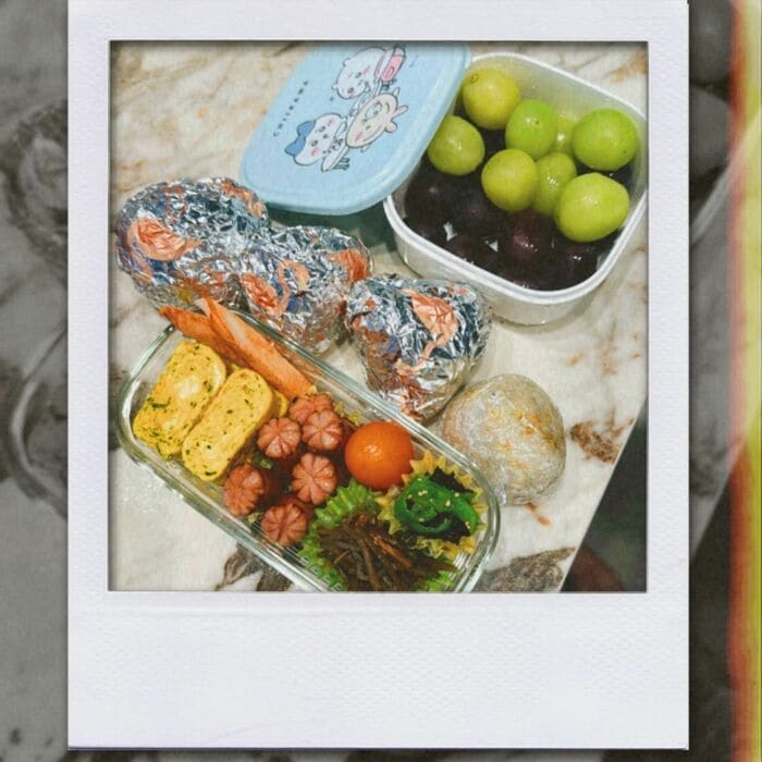 おにぎりを始め、卵焼きやきんぴら、お花模様の切り込みが入ったウインナーなど彩り豊かで目で見ても楽しめる工夫が施されたおかずや、人気キャラクターのお弁当箱に旬のぶどうがたっぷり入ったお弁当を披露しています。