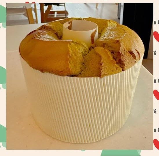 オーブンから出した直後でしょうか。写真には大きな型にはまる、ふっくら焼き上がったシフォンケーキが!よーく冷まし、型から外してみると…?