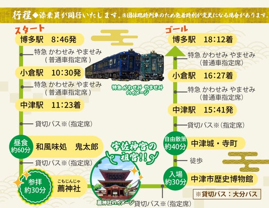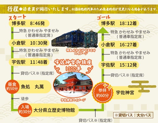(1)ツ ア ー 名 称:宇佐神宮御鎮座1300年記念 第二弾「特急 かわせみ やませみ」で行く大分北部満喫のたび(2)出 発 日 :2025年月10月18日(土) 日帰り