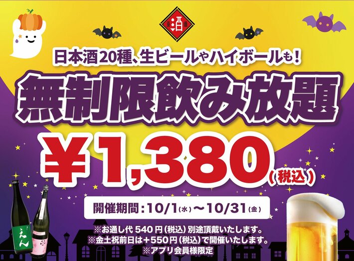時間無制限飲み放題が1,380円(税込)~でご利用いただける大変お得なキャンペーンを【10月限定】で開催いたします!