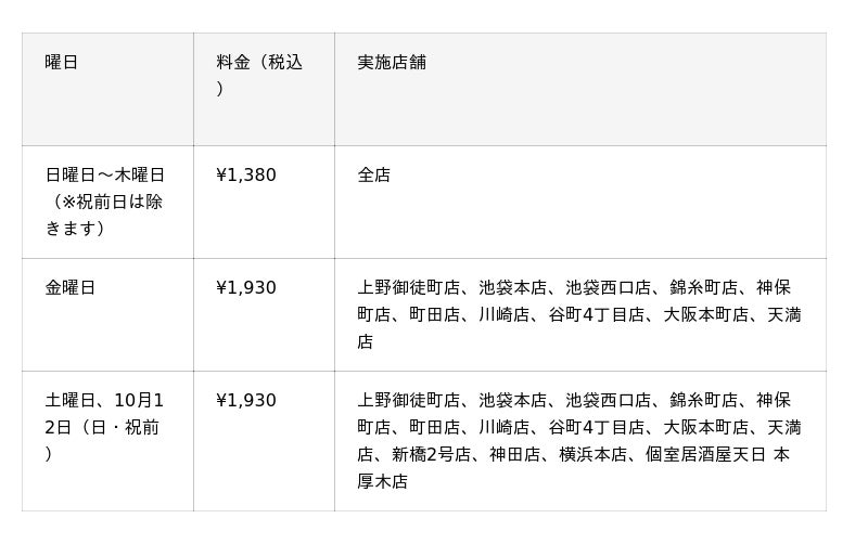 ・上野御徒町店、池袋本店、池袋西口店、錦糸町店、神保町店、町田店、川崎店、谷町4丁目店、大阪本町店、天満店は¥1,930(税込)で金曜、土曜、祝前日も開催します