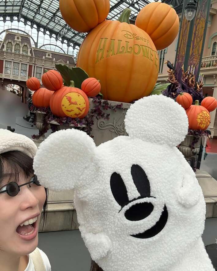 2025年9月17日から開催されているスペシャルイベント「ディズニー・ハロウィーン」を満喫したそうで、ミッキーの形になった大きなカボチャのオブジェをバックにパシャリ。