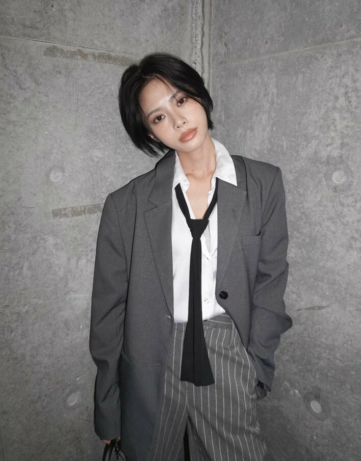 白いシャツにグレーのジャケットを羽織り、黒いネクタイを緩めにしめたスタイルで、首をかしげてポージングをしていて、首の下辺りまで伸びていた髪の毛は、耳の少し下ほどまでに短くなり、すっきりと爽やかでクールな印象を放っています。
