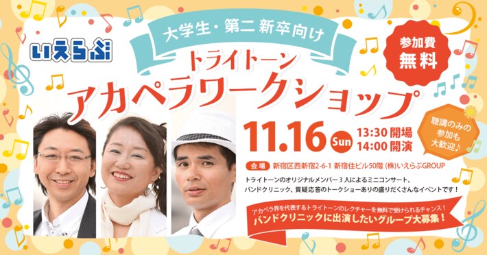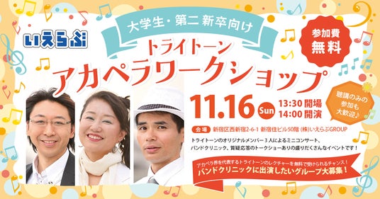 不動産業界特化のDX支援サービスを展開する、株式会社いえらぶGROUP(本社:東京都新宿区、代表取締役:岩名泰介、以下「いえらぶGROUP」)は、日本を代表する混声アカペラグループ「トライトーン」による、大学生・第二新卒を対象とした特別ワークショップを主催いたします。
