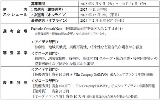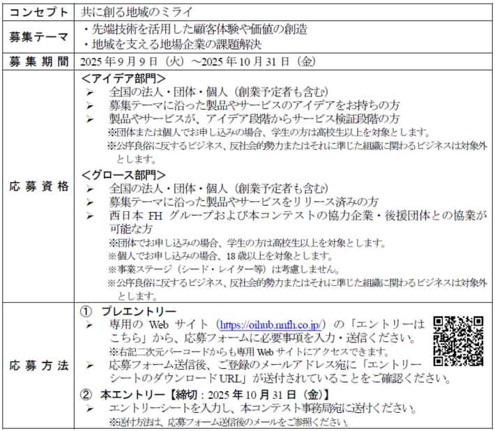 本コンテストは、西日本 FH グループや地場企業との協業機会を創出し、地域経済の活性化や課題解決に繋がるビジネスモデルの創出を目指すオープンイノベーション型のビジネス・アイデアコンテストです。