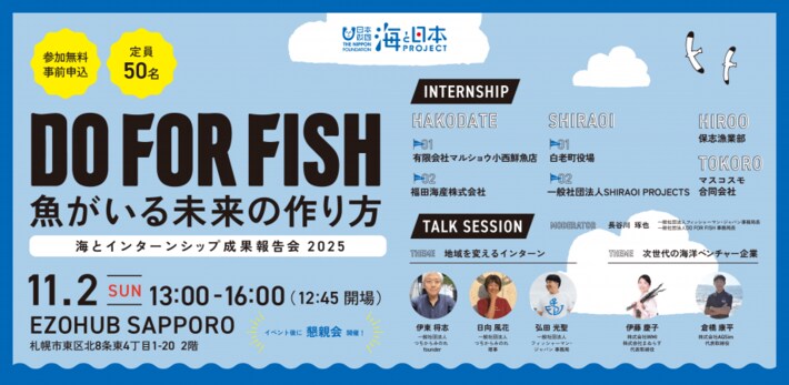 一般社団法人DO FOR FISH(所在地:北海道、代表理事:本間雅広、以下DFF)は、2025年11月2日(日)、札幌市内にて「魚がいる未来の作り方- 海とインターンシップ 成果報告会 2025 -」を開催します。