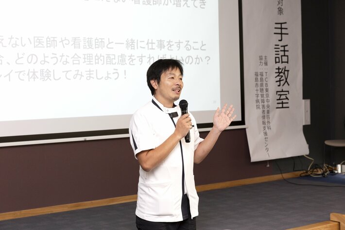 本手話教室では、耳鼻咽喉科出身のTCB中園医師が、福島県聴覚障害者協会所属の手話講師とともに、医療現場におけるろう者との円滑なコミュニケーションの必要性を伝え、医療現場に潜む「医療格差」の解消に向けた第一歩を踏み出す機会を提供します。