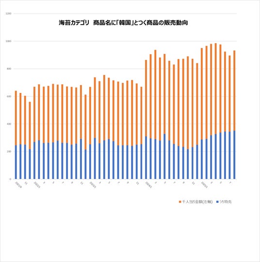 日経POS集計期間:2021年9月~2025年8月 商品キーワード「韓国」 対象カテゴリ:ノリ