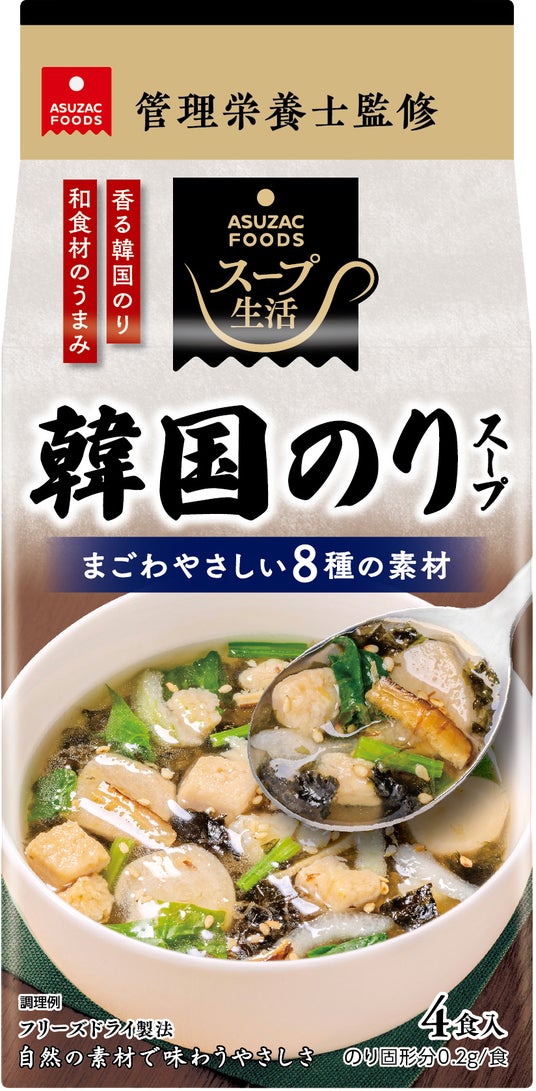 フリーズドライおよびエアードライなど乾燥食品の開発・製造を手掛けるアスザックフーズ株式会社(代表取締役:久保正直、本社:長野県須坂市)は、管理栄養士監修の「韓国のりスープ4食」を2025年9月1日(月)より順次発売いたしました。https://asuzacfoods.co.jp/
