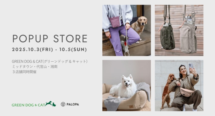 weskiii(ウェスキー)株式会社(本社:東京都港区、https://weskiii.com/ )は、輸入代理店として取り扱うドイツ発のドッグアイテムブランド『PALOPA(パロパ)』のPOPUP STOREを、2025年10月3日(金)から10月5日(日)までの3日間、ペットグッズ・ケアの専門店「GREEN DOG & CAT(グリーンドッグ & キャット)」東京ミッドタウン店・代官山店・湘南店にて同時開催いたします。また、PALOPAアイテムは、GREEN DOG & CATの通販サイトでも一部取扱いしています。