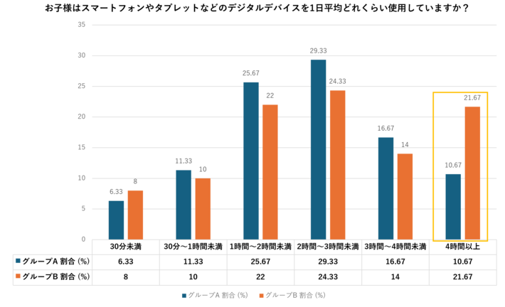 ●スマホなどデジタルデバイスを1日平均4時間以上使用する割合が、手帳使用者は10.7%、手帳非使用者は21.7%と約2倍の差子どものデジタルデバイス(スマートフォンやタブレットなど)の1日平均使用時間について尋ねたところ、「4時間以上」の長時間利用の割合がグループBは21.7%、グループAは10.7%とその差は約2倍に達していました。