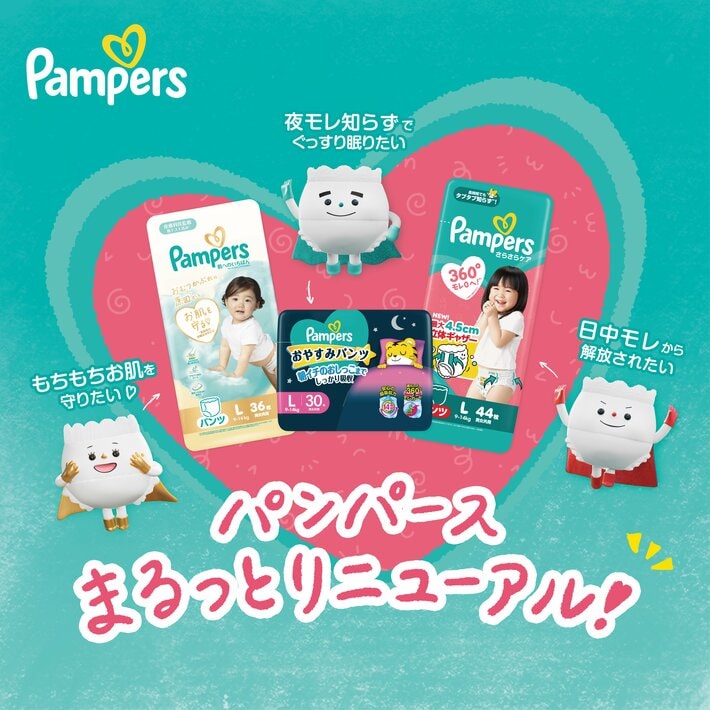 新Web動画では、各製品ラインにおける、よくあるおむつ悩みをご紹介。“子どもが遊びに夢中なときほど、モレやおむつ替えが心配になる”・“おむつかぶれの原因(肌表面の余剰水分のこと)からお肌を守りたい”・“忙しい朝、朝イチのおしっこもしっかり吸収して欲しい”などのシチュエーションにおいて、力強くも愛らしいパンパース独自の新キャラクター「オムツヒーローパンパース」がお悩みを解決していく様子を描いています。リニューアルしたパンパースにより、赤ちゃんが笑顔を取り戻し、おむつ周りの悩みから無敵になっていく姿をお楽しみください。