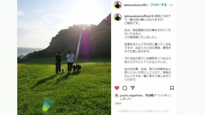 滝沢さんのInstagramには、横澤夏子さん、東野幸治さん、青山テルマさん、朝日奈央さん、飯豊まりえさんといった芸能人をはじめ、一般の方からもたくさんの祝福メッセージが届いています。