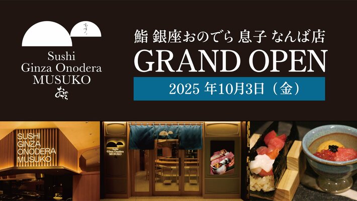 株式会社ONODERAフードサービス(代表取締役社長:長尾 真司 所在地:東京都千代田区)は、2025 年10 月3 日(金)、大阪・なんばに『カウンター鮨入門店』をコンセプトとした「鮨 銀座おのでら 息子 なんば店」をグランドオープンすることとなりましたのでお知らせいたします。