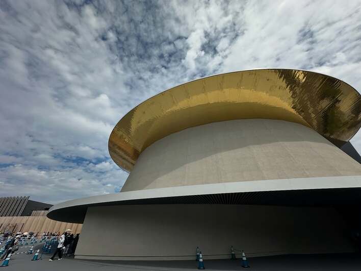 さらにつるのさんは、トークショーを行った黄金に輝く円形の大屋根が特徴のEXPOホール「シャインハット」の写真も投稿。このEXPOホールは1970年に開催された大阪万博の「太陽の塔」を連想させる会場全体のシンボルです。