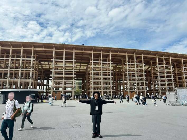 写真には、大屋根リングをバックに大きく両手を広げるつるのさんの姿。そびえ立つ大屋根リングの壮大さに改めて圧倒されてしまいます。
