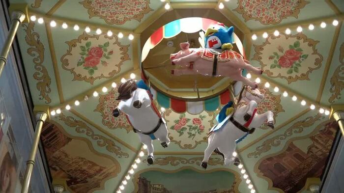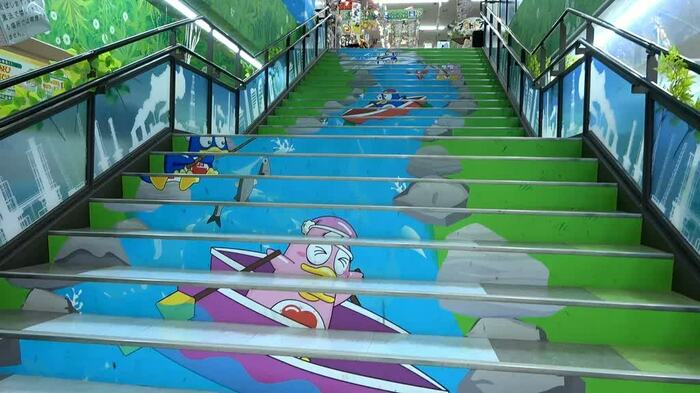 後楽園店の階段には、ノスタルジックな遊園地をイメージし、上部にメリーゴーランドを設置。また、神奈川・鶴見中央店の階段には、公式キャラクター・(ペンギンの)ドンペンが川下りをしているイラストが描かれています。