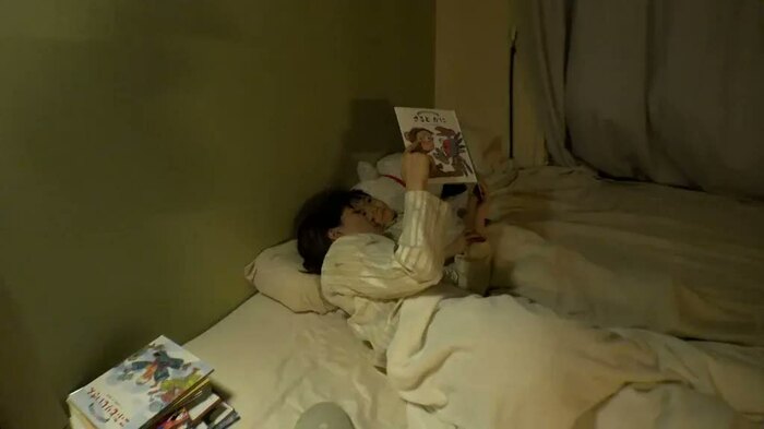 なるみくんは、寝る時間の午後9時になると、12冊の本を持ち布団へ。