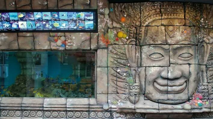 外観にペンギンの人形を取り付けた浅草店のデザインや、大阪・梅田店には、カンボジア旅行に行ったときに見たという遺跡、アンコール・トムをモチーフに巨大な顔のオブジェを装飾。