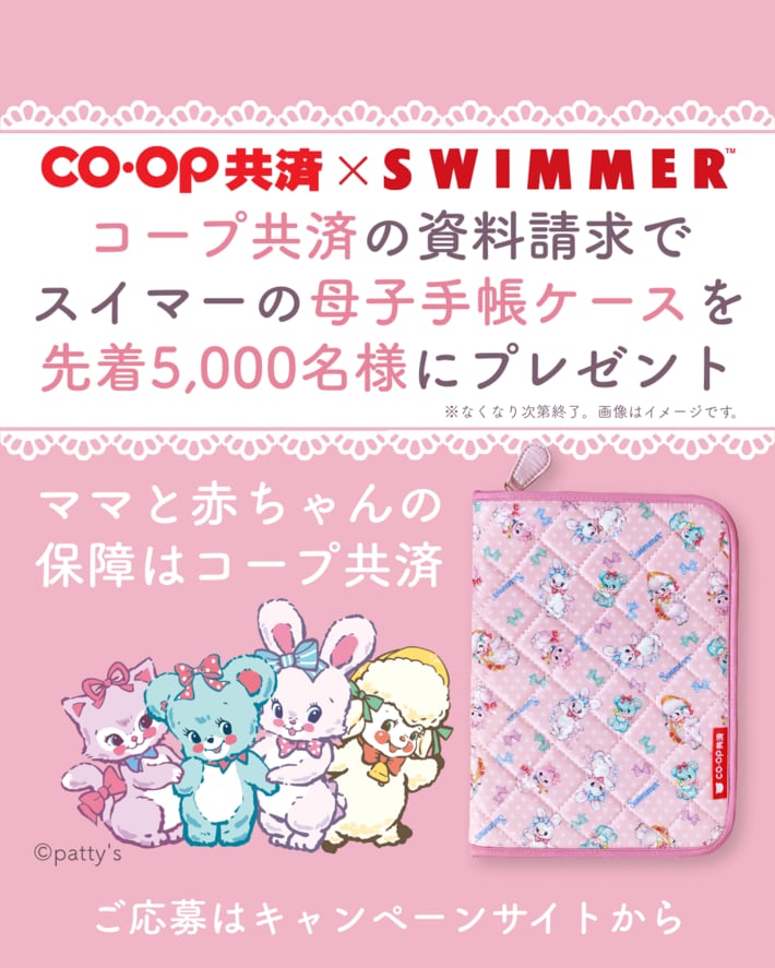 CO・OP共済の資料を請求すると、SWIMMERデザインの母子手帳ケースがもらえるキャンペーンを開催します。“かわいいがぎゅっ!”と♪つまった母子手帳ケースをぜひゲットしてください♪