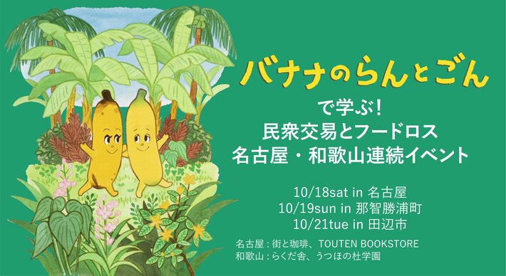 特定非営利法人APLAと、和歌山の地方出版レーベルらくだ舎出帆室が企画し、【絵本『バナナのらんとごん』で学ぶ、民衆交易とフードロス】をテーマに、名古屋と和歌山県紀南地方で連続イベントを行います。