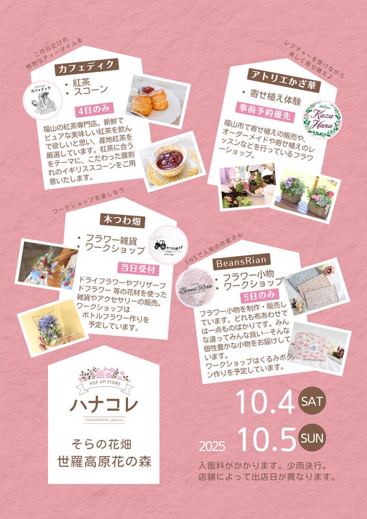10月4日(土)・5日(日)の2日間限定でポップアップストア「ハナコレ」を開催します。ティータイムを過ごせる紅茶やスコーンの販売、寄せ植え体験、フラワー雑貨のワークショップ、フラワー小物の販売など、2日間だけの特別なポップアップストアです。