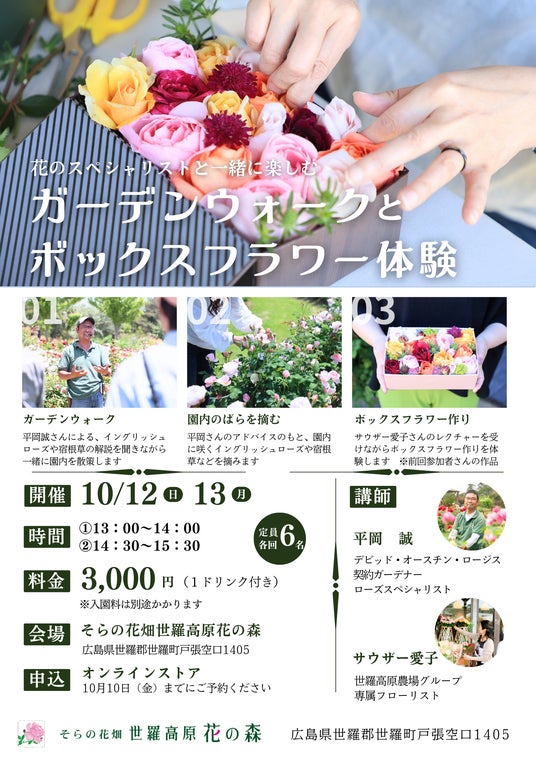 そらの花畑世羅高原花の森では現在「ローズ&フラワーガーデン」を開催中です。ばらや宿根草が見ごろを迎える10月、週末限定で特別なイベントをご用意しています。