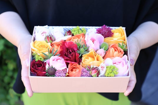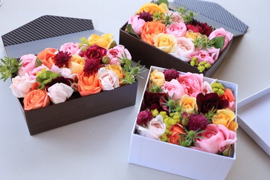園内で摘み取ったイングリッシュローズで作るボックスフラワー ※写真は春に参加されたお客様の作品